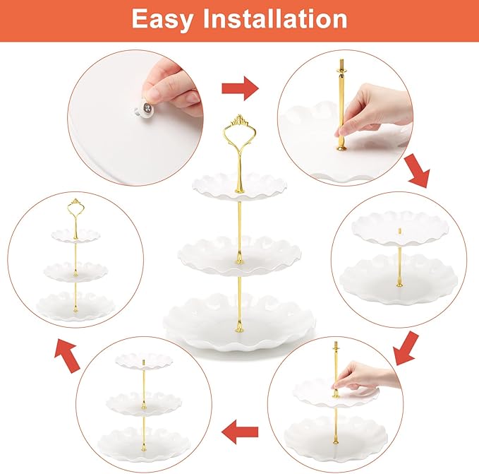 - [Easy Assembly]: The whole cupcake stand has strength and stability when connected with solid metal pillars and screws. Assembling is made easier with the included washers.