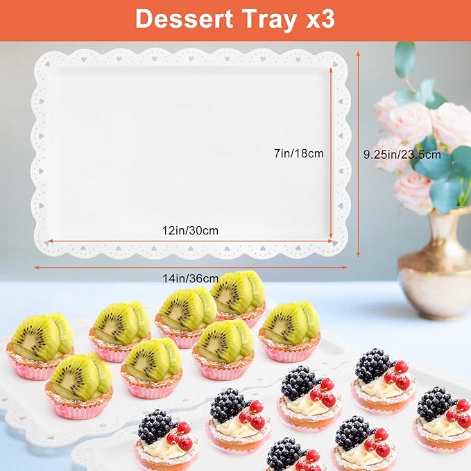 - [Complete Party Set]: This 5-piece set includes 2 three-tiered cupcake stands and 3 appetizer trays, made of food-safe PP material, ideal for displaying cupcakes, cookies, fruit, and more.